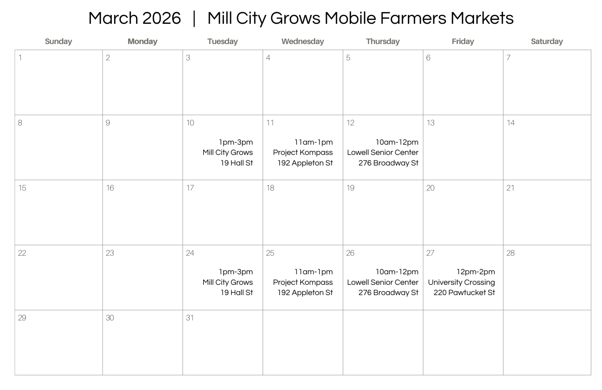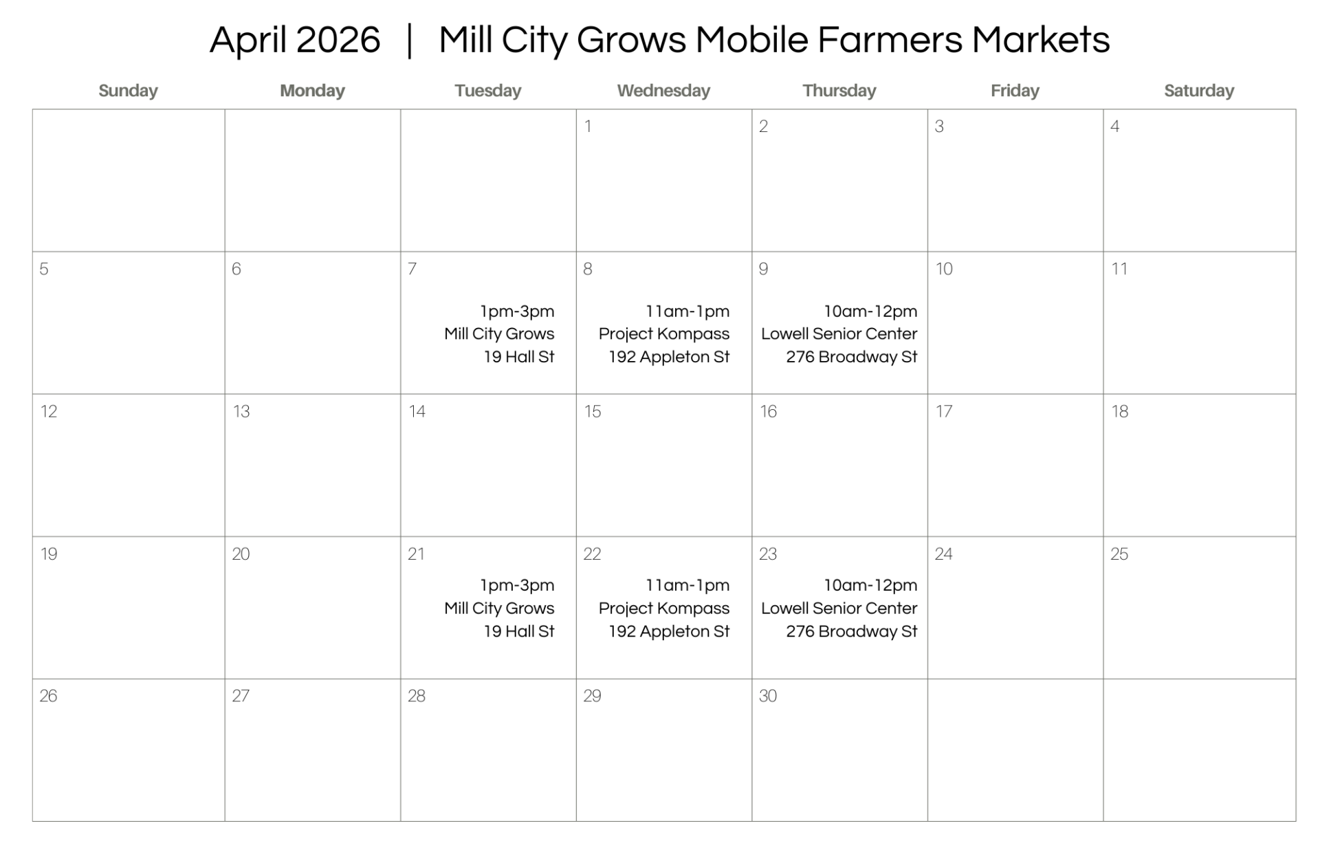 January – April 2026 | Lowell, MA